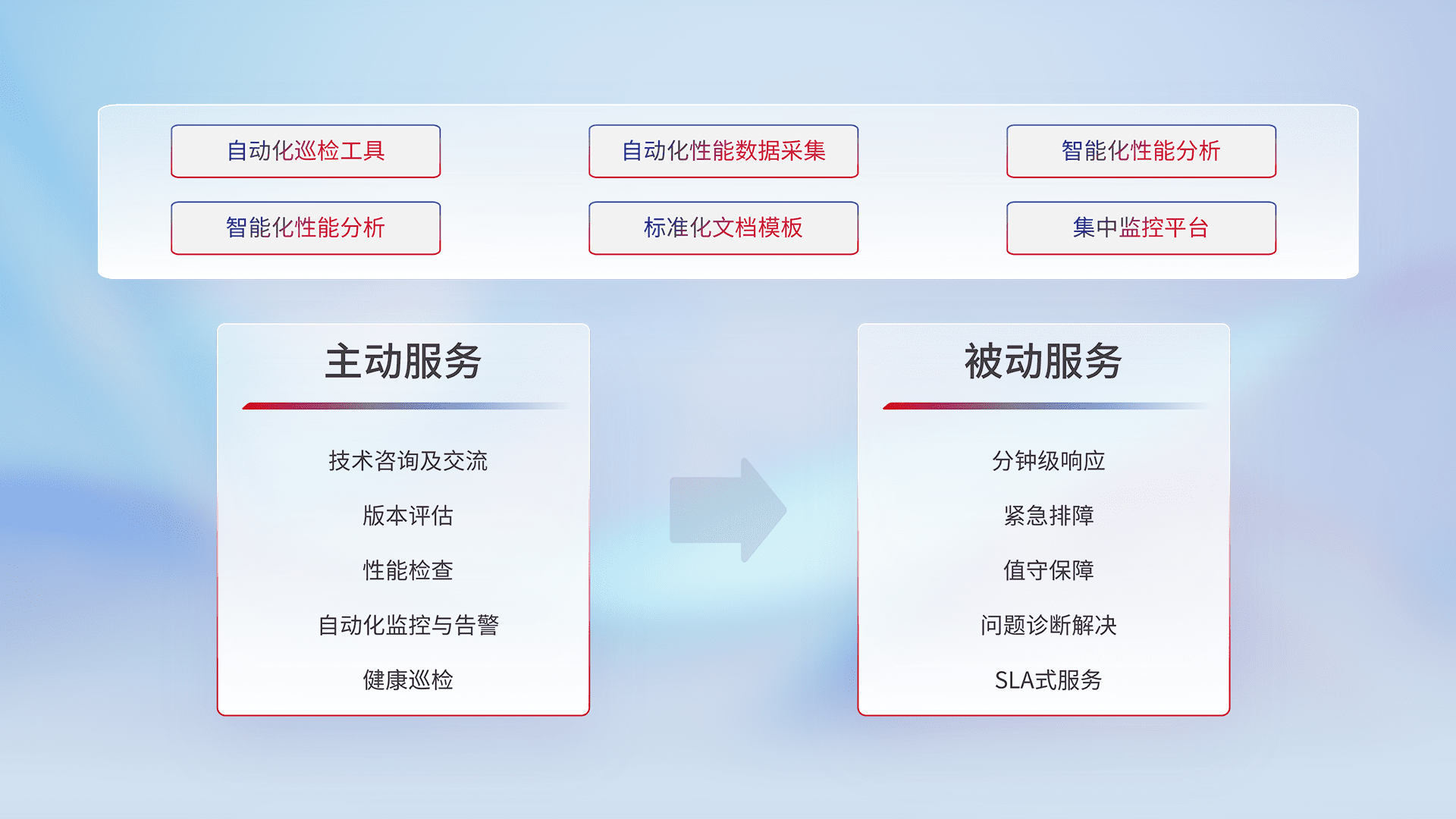 智能化工具和标准化文档,,,,保障服务质量,,,提供主动服务(包含技术咨询、、、版本评估、、性能检查、、自动化监控与告警、、健康巡检)和被动服务包含(分钟级响应、、、、紧急排障、、、、值守保障、、、问题诊断解决、、、SLA服务)。。。