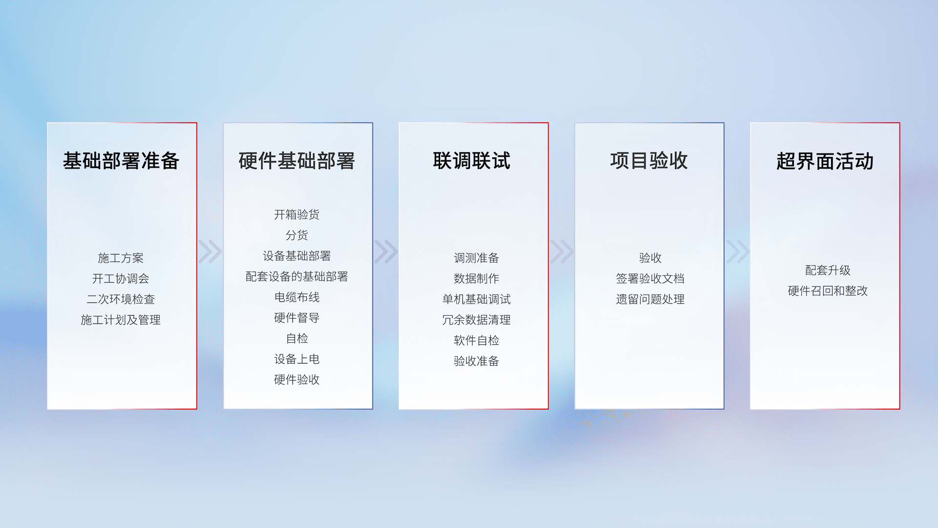 从基础部署准备、、、、硬件基础部署、、联调联试、、、、项目验收、、、、越界面活动的全过程可追溯,,,,保证施工质量和进度。。。